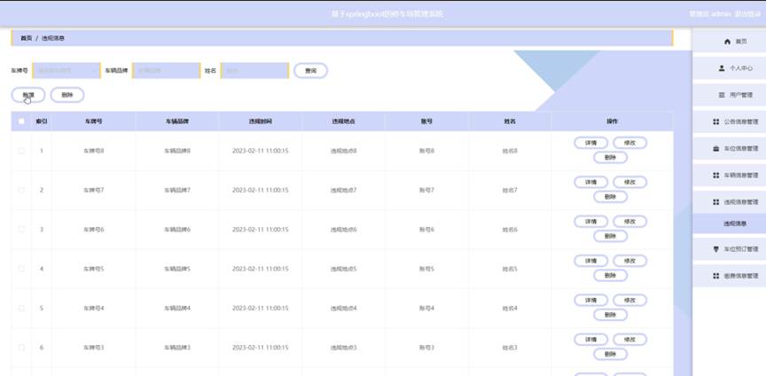 管理员点击违规信息管理。在违规信息页面输入车牌号、车辆品牌、姓名进行查询、新增或删除违规信息列表,并根据需要对违规详情信息进行详情、修改或删除操作;如图5-7所示: