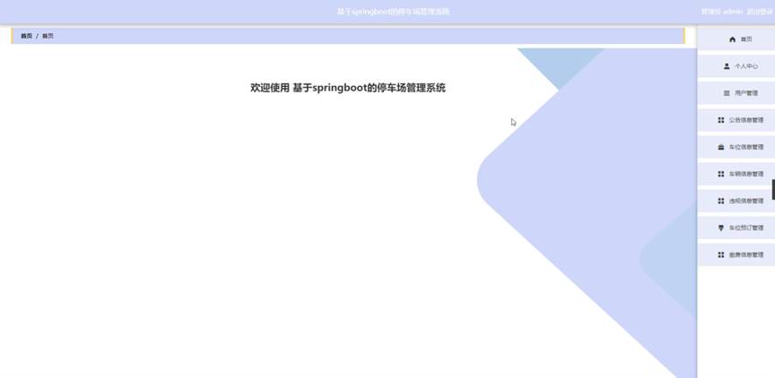 管理员进入主页面,主要功能包括对个人中心、用户管理、公告信息管理、车位信息管理、车辆信息管理、违规信息管理、车位预订管理、缴费信息管理等进行操作。管理员主页面如图5-3所示: