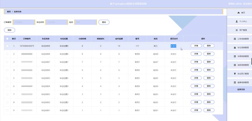 管理员点击缴费信息管理。在缴费信息页面输入订单编号、车位名称、姓名进行查询或删除缴费信息列表,并根据需要对缴费详情信息进行详情或删除操作;如图5-9所示: