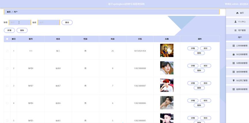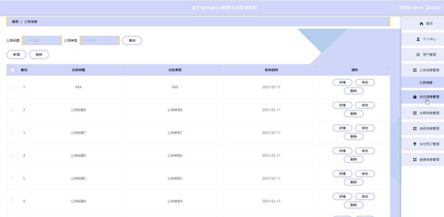 管理员登录进入系统直接管理个人中心、用户管理、公告信息管理、车位信息管理、车辆信息管理、违规信息管理、车位预订管理、缴费信息管理等信息。本网站模块设计的独立性强,用户体验良好、后期维护修改管理十分方便。