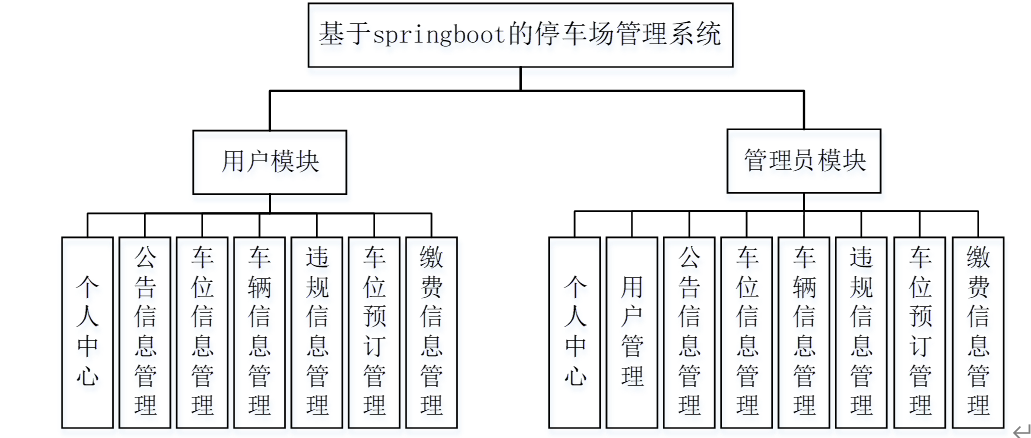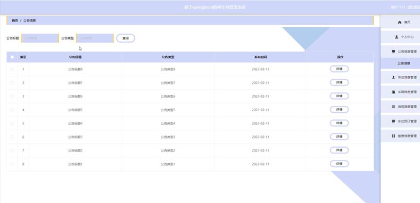 系统涵盖管理员、用户两大角色功能,核心模块包括个人中心、用户管理、公告信息管理、车位信息管理、车辆信息管理、违规信息管理、车位预订管理、缴费信息管理等。管理员统筹平台管理;用户可查询车位、在线预订、缴纳费用。系统支持车位实时查询、预订审核、在线缴费等功能,实现了停车场管理全流程的数字化与规范化。