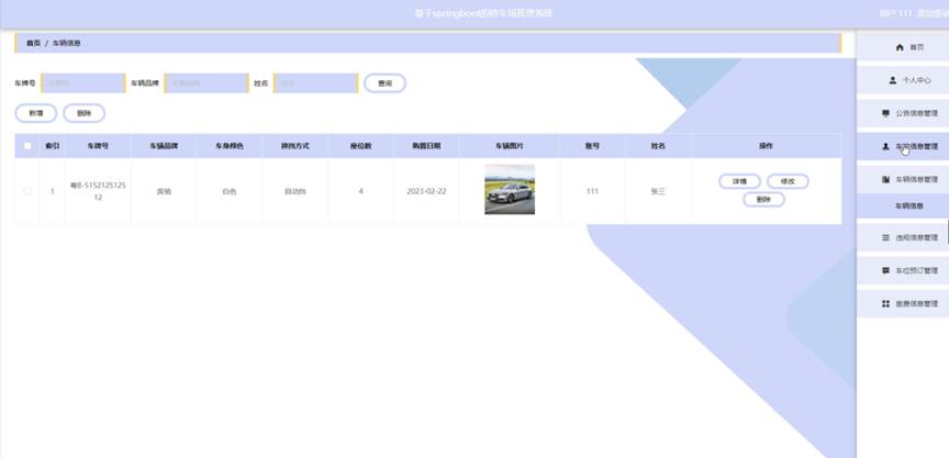 用户点击车辆信息管理。在车辆信息页面输入车牌号、车辆品牌、姓名进行查询、新增或删除车辆信息列表,并根据需要对车辆详情信息进行详情、修改或删除操作;如图5-13所示: