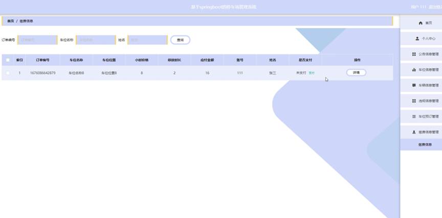 用户点击缴费信息管理。在缴费信息页面输入订单编号、车位名称、姓名进行查询缴费信息列表,并根据需要对缴费详情信息进行详情操作;如图5-16所示: