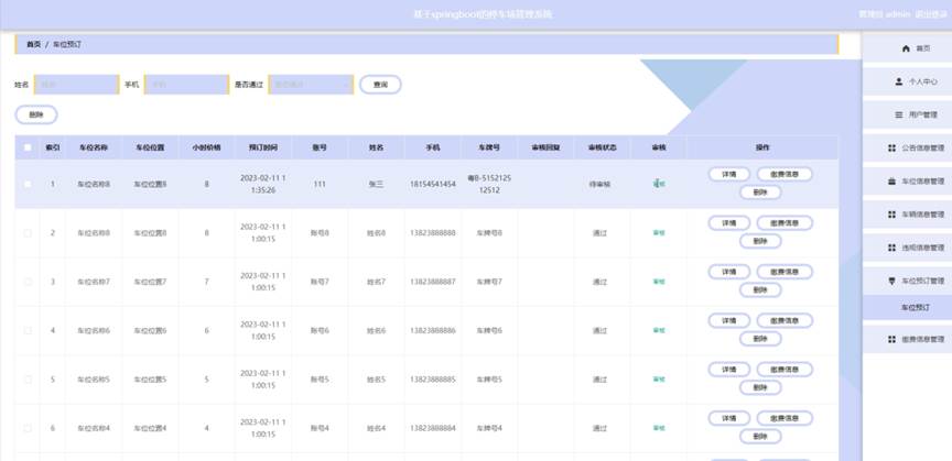 管理员点击车位预订管理。在车位预订页面输入姓名、手机、是否通过进行查询或删除车位预订列表,并根据需要对车位预订详情信息进行详情、缴费信息或删除操作;如图5-8所示: