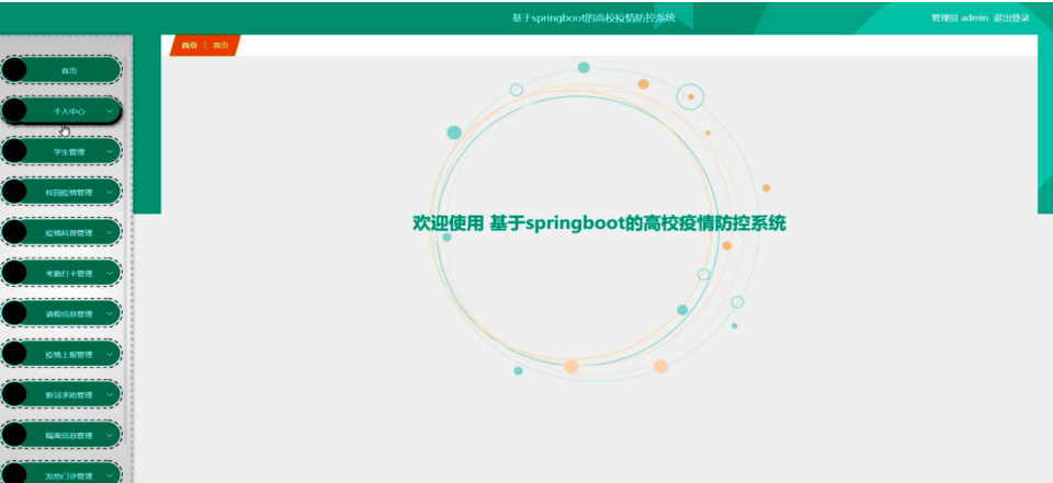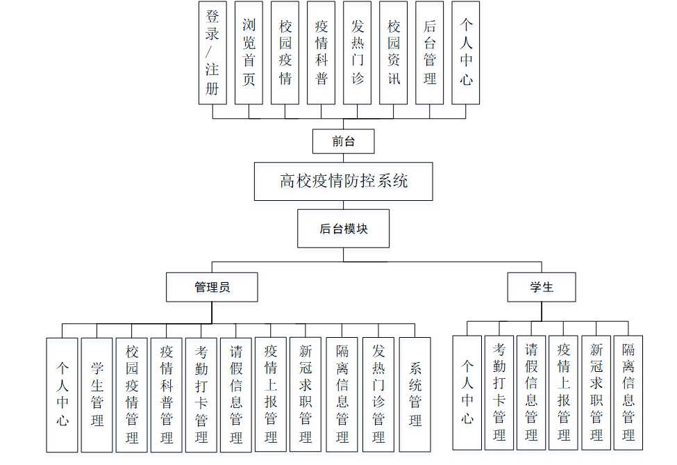 (1)功能要求:管理人员可以管理自己的个人中心、学生管理、校园疫情管理、疫情科普管理、考勤打卡管理、请假信息管理、疫情上报管理、新冠求职管理、隔离信息管理、发热门诊管理、系统管理等功能模块[3]。