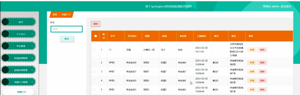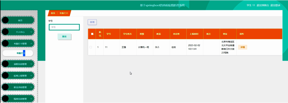 考勤打卡管理:学生可以通过系统进行每日健康打卡,记录体温和健康状况,管理员可以查看打卡记录,及时发现异常情况。