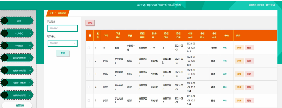 进入到疫情上报管理页面后,管理员可以浏览系统已有的疫情上报信息,进行审核、查看详情或删除等操作。疫情上报管理界面图如图5-8所示。