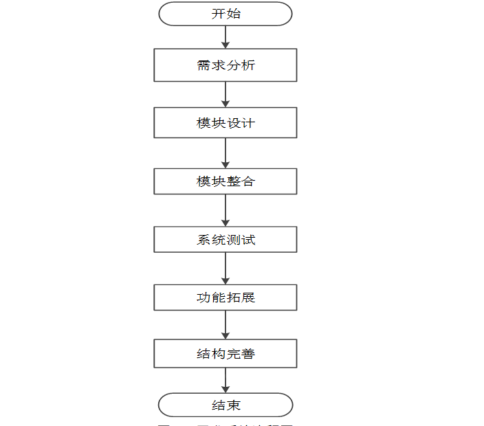 系统的开发流程设计简单的介绍了开发过程,先对任务书进行分析,根据要实现的功能对各个模块进行开发,之后再对模块一一进行测试,测试成功后将模块整合再测试整体功能,完善整体结构[6]。开发系统流程图如图4-3所示。