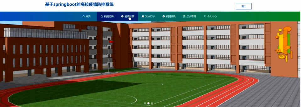 用户在系统前台可以进行注册、登录的操作,登录后可以对首页、校园疫情、疫情科普、发热门诊、校园资讯、后台管理、个人中心等功能模块进行管理。系统前台界面图如图5-13所示。