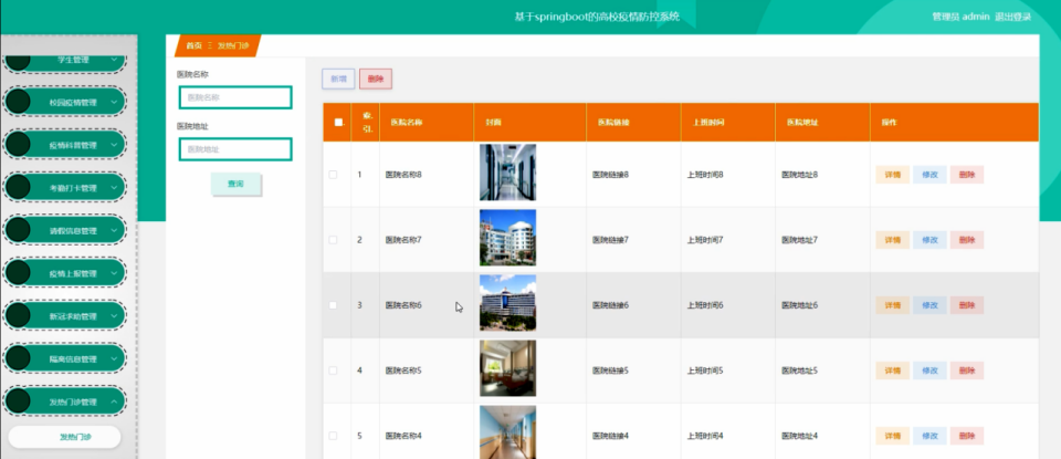 发热门诊管理:记录和管理发热门诊的信息,包括医院名称、地址、联系方式等,方便师生在需要时快速获取医疗资源。