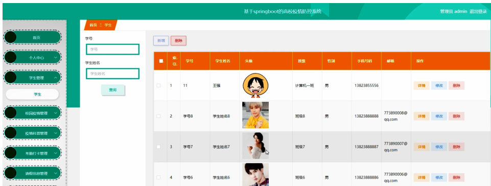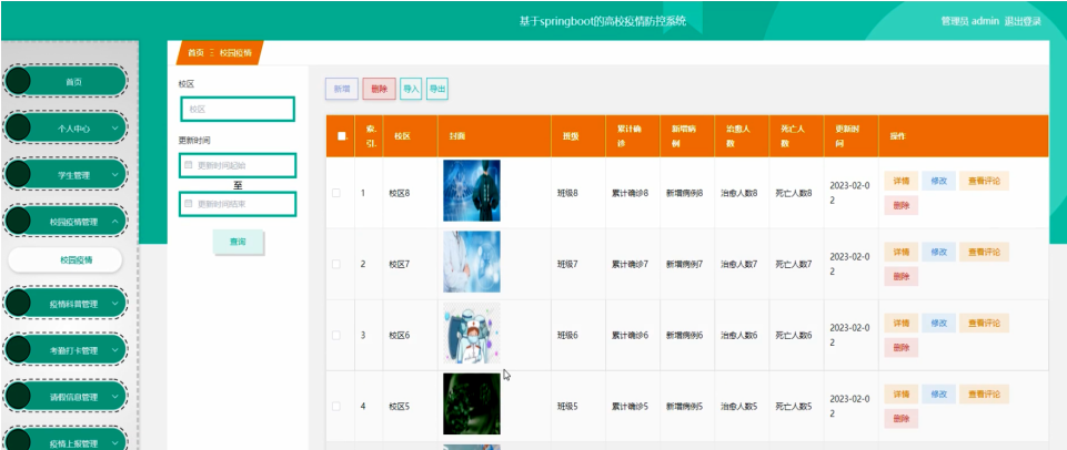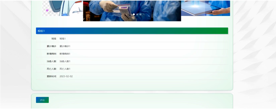 校园疫情管理:系统能够实时记录和更新校园内的疫情数据,包括感染人数、隔离人数、康复人数等,为疫情防控决策提供数据支持。