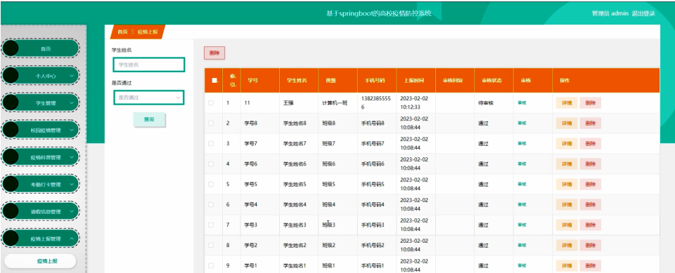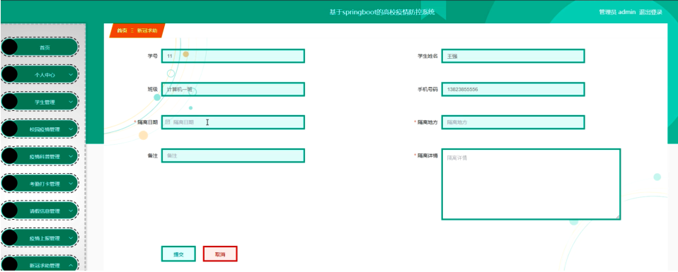 疫情上报管理:学生和教职工可以随时上报疫情相关情况,管理员可以对上报信息进行审核和处理。