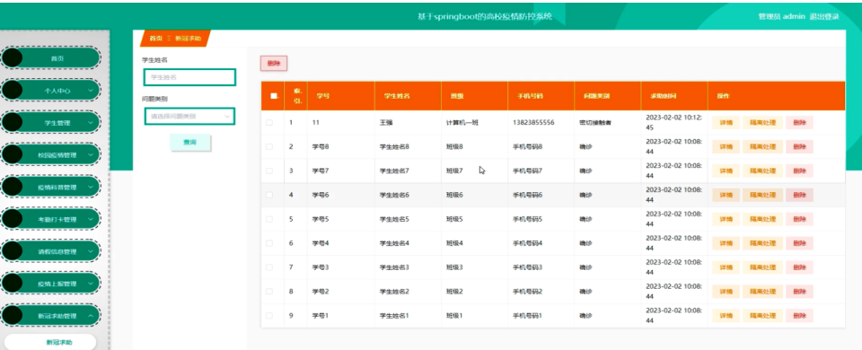 新冠求助管理:学生在遇到疫情相关问题时可以发起求助,管理员可以及时响应并提供帮助。