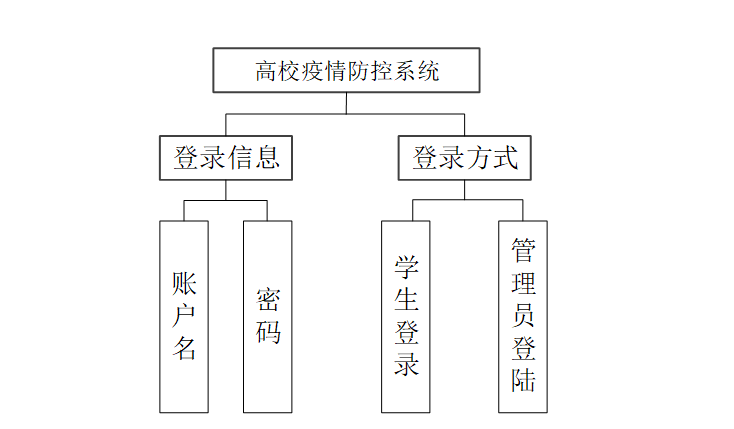 系统启动后,在登录界面,输入正确的账号密码,选择进入管理员界面或用户界面,管理员界面是用来管理页面与用户,用户界面可以正常的使用校园疫情、疫情科普、发热门诊、校园资讯、后台管理、个人中心等功能,系统登录结构图如图4-1所示。