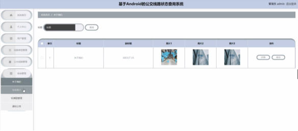 公交线路管理,管理员可在公交线路管理页面查看公交车号、路线图片、线路类型、线路状态、车次、途径站点、始发站点、终点站点、运行时间、更新时间等内容,如图5-11所示。