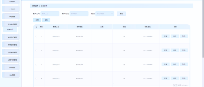 监考老师管理,管理员可以对教师工号、教师姓名、头像、性别、联系电话进行查询、新增、修改和删除等操作,如图5-12所示。