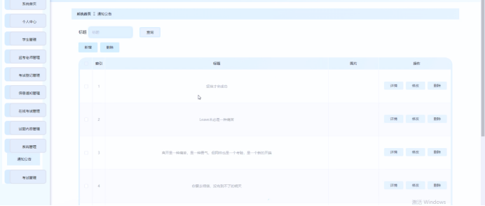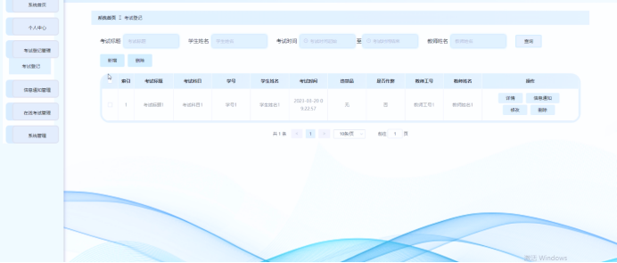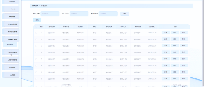 考试登记管理,在考试登记页面,监考老师可以输入考试标题、学生姓名、考试时间、教师姓名进行查询,新增、删除的操作,并对考试登记进行详情、信息通知、修改和删除等操作,如下图所示。