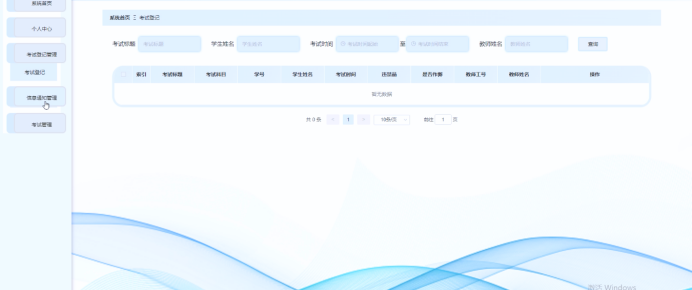 考试登记管理,在考试登记页面可以输入考试标题、学生姓名、考试时间、教师姓名进行查询等操作,详情页面如下图所示。