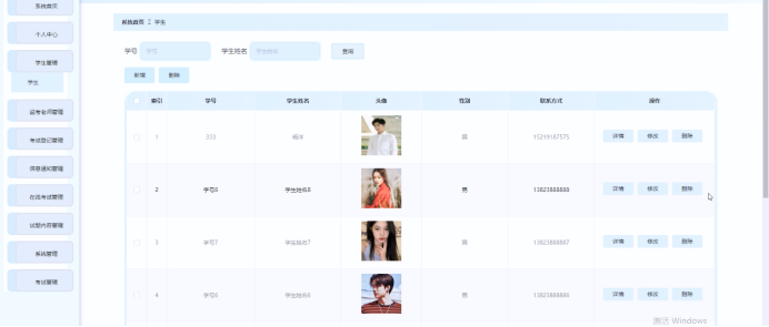 学生管理,管理员可以对学号、学生姓名、头像、性别、联系方式进行查询、新增、修改和删除等操作,如图5-11所示。