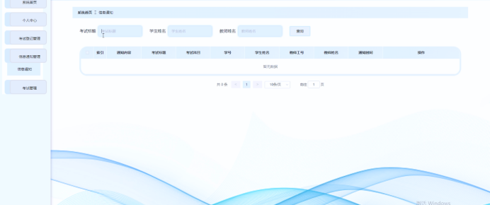 信息通知管理,在信息通知页面可输入考试标题、学生姓名、教师姓名进行查询等操作,信息通知管理页面如下图所示。