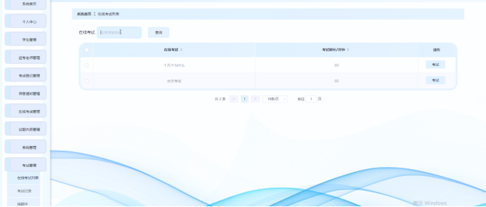 考试管理,在考试管理的功能有在线考试列表、考试记录、错题本;点击在线考试列表页面,可以对在线考试进行在线考试,如图5-6所示。