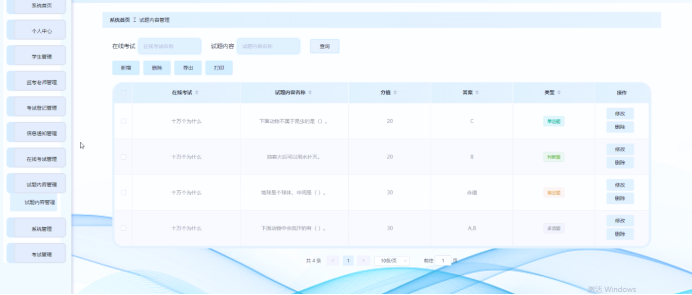 试题内容管理,在试题内容管理页面可以对在线考试、试题内容名称、分值、答案、类型等进行查看、新增、删除、导出、打印、修改等操作,如图5-14所示。