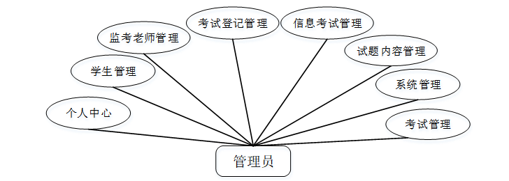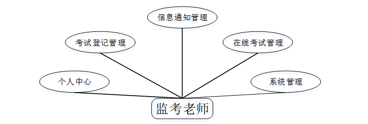 (3)管理员用例:教师主要实现了个人中心、学生管理、监考老师管理、考试登记管理、信息考试管理、试题内容管理、系统管理、考试管理等功能,教师用例图如图3-2所示。