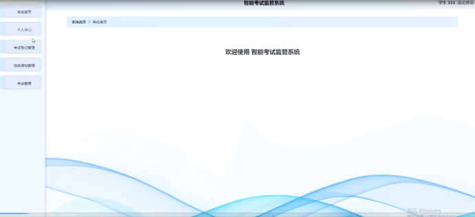 学生使用账号登陆进系统后台页面后,可以对个人中心、考试登记管理、信息通知管理、考试管理等操作。学生功能界面显示如图5-3所示。