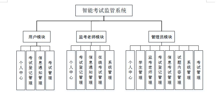 通过探索和研究分析,开发人员对系统的功能和实现目标会有更加清晰而深刻的理解,并对系统施加一系列约束。本系统包含了学生、监考老师、管理员三个功能模块,其中学生模块基本实现了个人中心、考试登记管理、信息通知管理、考试管理等功能;监考老师模块基本实现了个人中心、考试登记管理、信息通知管理、在线考试管理、系统管理等功能;管理员模块主要实现了对个人中心、学生管理、监考老师管理、考试登记管理、信息考试管理、试题内容管理、系统管理、考试管理等功能的管理。