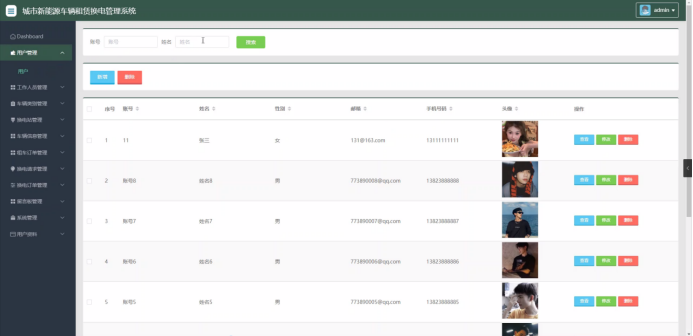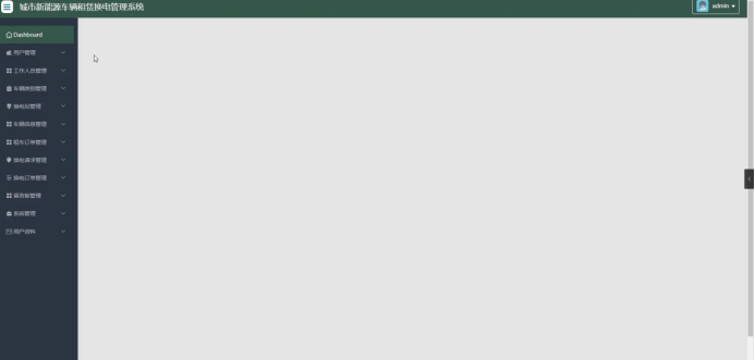 管理员进入主页面,主要功能包括对系统首页、用户管理、工作人员管理、车辆类别管理、换电站管理、车辆信息管理、租车订单管理、换电请求管理、换电订单管理、留言板管理、系统管理、用户资料等进行操作。管理员主页面如图5-6所示: