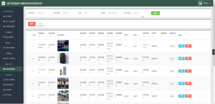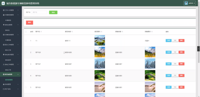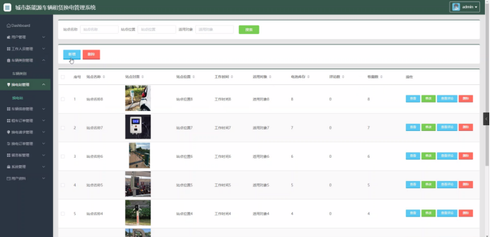 换电站功能在视图层(view层)进行交互,比如点击“搜索、新增或删除”按钮或填写换电站信息表单。这些换电站表单动作被视图层捕获并作为请求发送给相应的控制器层(controller层)。控制器接收到这些请求后,调用服务层(service层)以执行相关的业务逻辑,例如验证输入数据的有效性和与数据库的交互。服务层处理完这些逻辑后,进一步与数据访问对象层(DAO层)交互,后者负责具体的数据操作如详情、修改、查看评论或删除换电站信息,并将操作结果返回给控制器。最终,控制器根据这些结果更新视图层,以便换电站功能可以看到最新的信息或相应的操作反馈。换电站界面如图5-10所示: