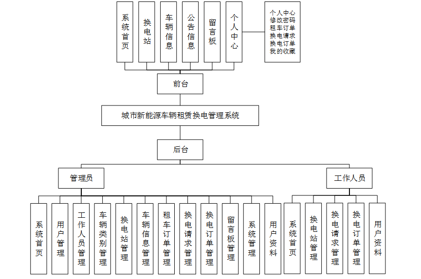 城市新能源车辆租赁换电管理系统综合网络空间开发设计要求。目的是将传统管理方式转换为在网上管理,完成城市新能源车辆租赁换电管理的方便快捷、安全性高、交易规范做了保障,目标明确。城市新能源车辆租赁换电管理系统可以将功能划分为管理员功能、用户功能和工作人员功能。