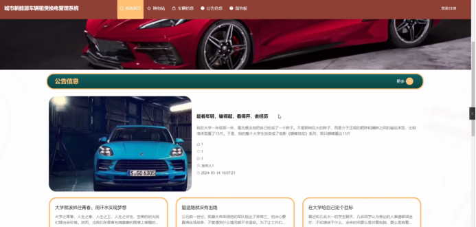 车辆门户:车辆列表、详情展示、剩余电量、续航里程、租赁价格、一键预约、立即租车、车辆评论与收藏