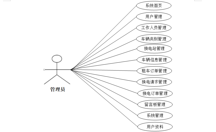 (1)、管理员关键功能包含系统首页、用户管理、工作人员管理、车辆类别管理、换电站管理、车辆信息管理、租车订单管理、换电请求管理、换电订单管理、留言板管理、系统管理、用户资料等进行管理。管理员用例如下: