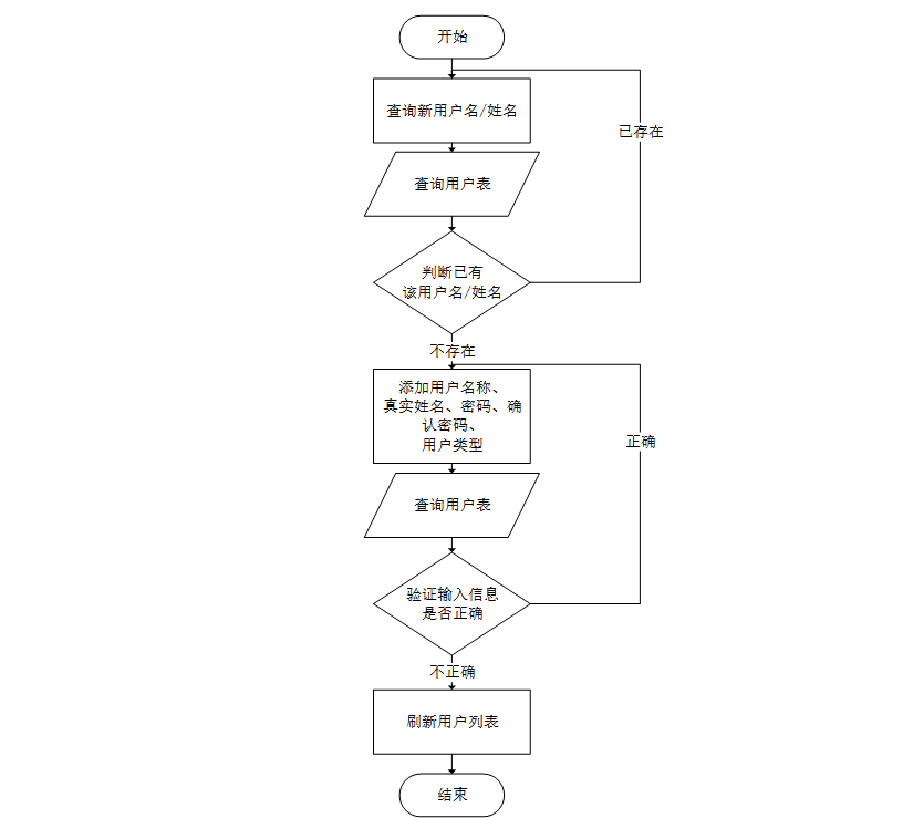 添加新用户的流程是先查询新用户名是否已存在,如已有该用户名,需重拟用户名并同时输入新用户的其它信息,添加新用户到数据库时会先验证数据是否完整,信息都正确且完整时,返回并刷新用户列表;信息不正确时,会返回输入信息的那一步。该流程如下图所示。