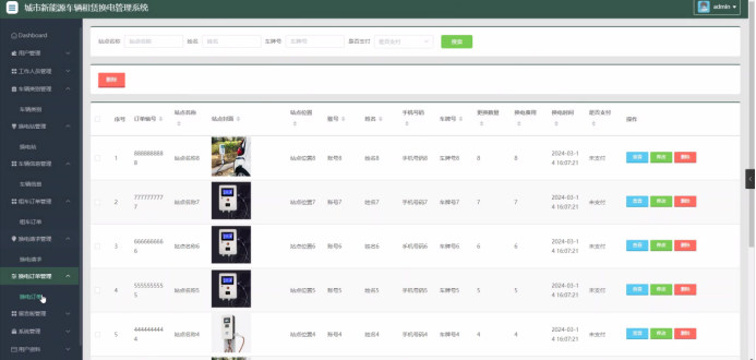 换电订单功能在视图层(view层)进行交互,比如点击“搜索或删除”按钮或填写换电订单信息表单。这些换电订单表单动作被视图层捕获并作为请求发送给相应的控制器层(controller层)。控制器接收到这些请求后,调用服务层(service层)以执行相关的业务逻辑,例如验证输入数据的有效性和与数据库的交互。服务层处理完这些逻辑后,进一步与数据访问对象层(DAO层)交互,后者负责具体的数据操作如查看、修改或删除换电订单信息,并将操作结果返回给控制器。最终,控制器根据这些结果更新视图层,以便换电订单功能可以看到最新的信息或相应的操作反馈。换电订单界面如图5-14所示:
