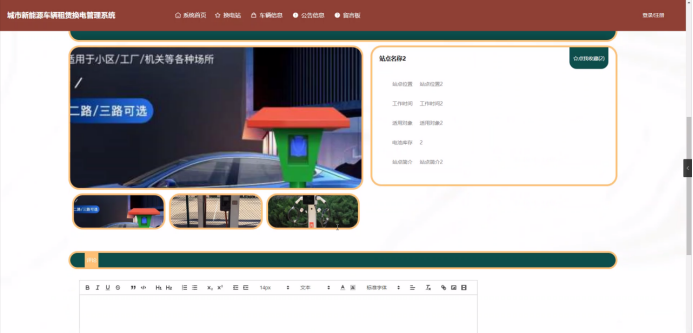 换电站:在换电站页面的输入栏中输入站点名称、站点位置、工作时间、适用对象、电池库存、站点简介进行查询,可以查看到换电站详细信息,并进行收藏或评论操作;换电站页面如图5-3所示: