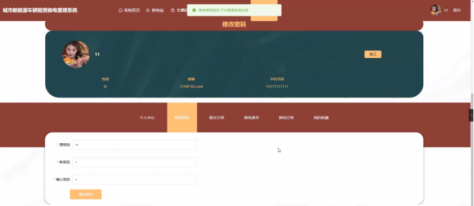 个人中心:在个人中心页面可以对个人中心、修改密码、租车订单、换电请求、换电订单、我的收藏进行详细操作;如图5-4所示: