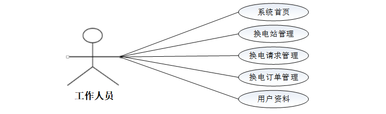 (2)、工作人员关键功能包含系统首页、换电站管理、换电请求管理、换电订单管理、用户资料等进行管理。工作人员用例如下: