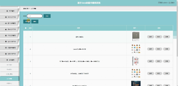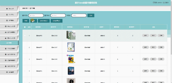 管理员点击图书信息管理。进入图书信息界面输入图书名称、图书作者和出版社可以查询、新增或删除图书分类统计和图书数量统计,并根据需要对图书信息详情信息进行详情,修改或删除操作。如图5-10所示: