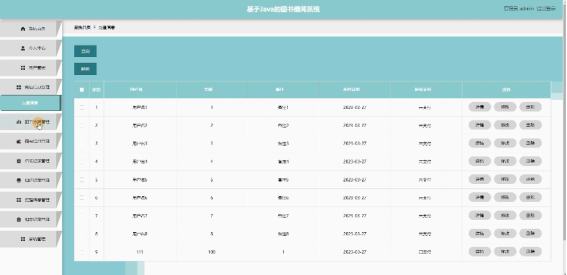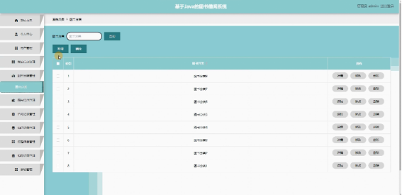 管理员点击图书分类管理。进入图书分类界面输入图书分类可以查询,新增和删除图书分类列表,并根据需要对图书分类详情信息进行详情、修改或删除操作。如图5-9所示: