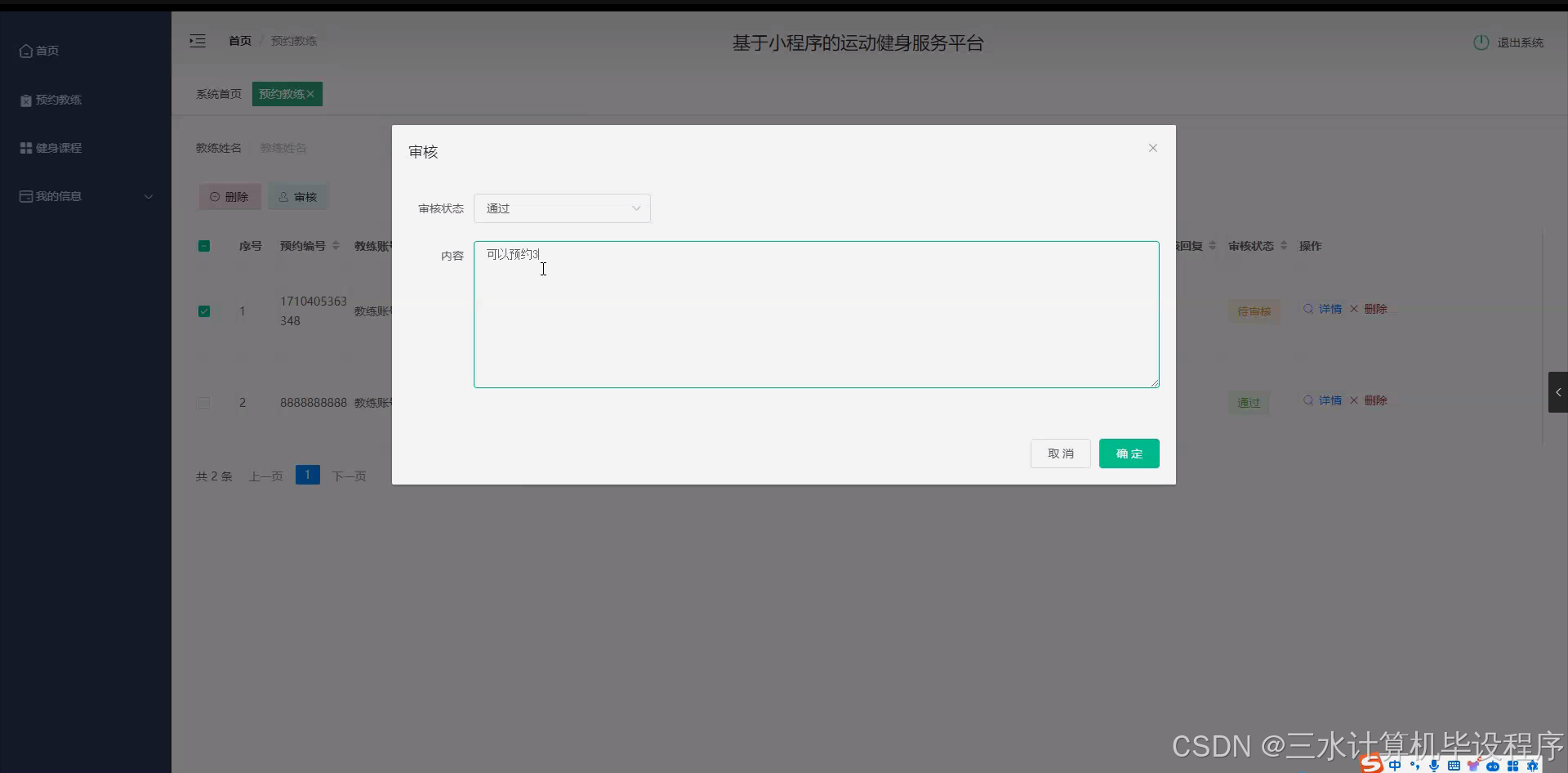 预约教练功能是系统的核心之一。用户可以通过系统查看教练的空闲时间,选择心仪的教练进行预约。系统根据用户的需求和教练的状态进行智能匹配,生成预约订单。