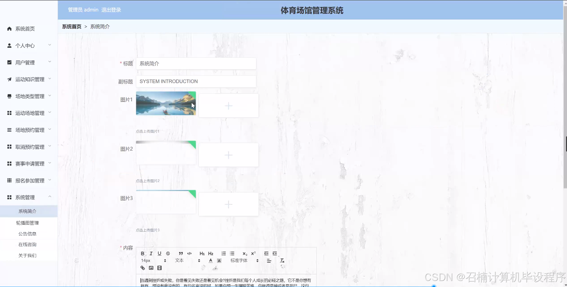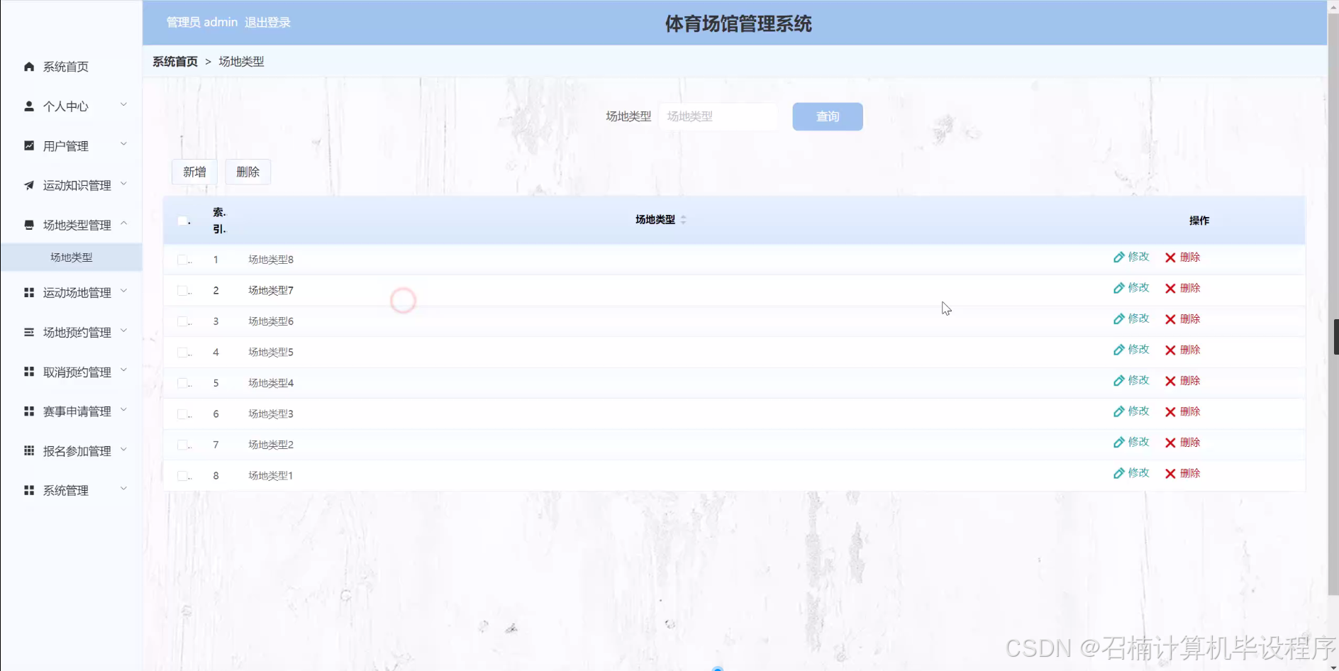 本研究旨在设计并实现一套功能完善的体育场馆管理系统,以满足场馆管理者和用户的多样化需求。通过该系统,场馆管理者可以实现对场馆资源的智能化管理,包括场地类型、运动场地、预约记录等信息的实时监控和调度。同时,用户可以通过系统方便地预约场地、取消预约、申请赛事、报名参加等活动,享受更加便捷、高效的体育服务。