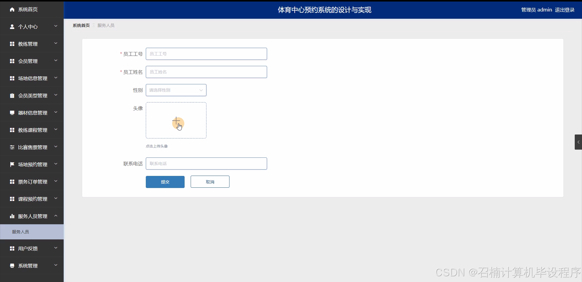 在系统功能方面,会员管理模块应支持会员注册、登录、个人信息管理等功能;场地信息管理模块应展示体育中心的各类场地信息,包括场地类型、容纳人数、设施设备等;场地预约管理模块应支持会员在线预约场地,查看预约状态,取消或修改预约等功能;会员类型管理模块应设定不同的会员等级和权益,如VIP会员、普通会员等;教练管理模块应展示教练的个人信息、专业资质和课程安排等;器材信息管理模块应展示体育中心提供的各类器材信息,包括器材名称、使用方法、注意事项等;教练课程管理模块应支持教练发布课程信息,会员报名课程等功能;比赛售票管理模块应支持比赛信息的发布、门票销售和票务管理等功能;票务订单管理模块应展示会员的购票记录和订单状态;课程预约管理模块应支持会员预约教练课程,查看课程进度等功能;服务人员管理模块应管理体育中心的服务人员信息,包括服务人员的工作职责、联系方式等,以便会员在需要时能够迅速找到对应的服务人员。