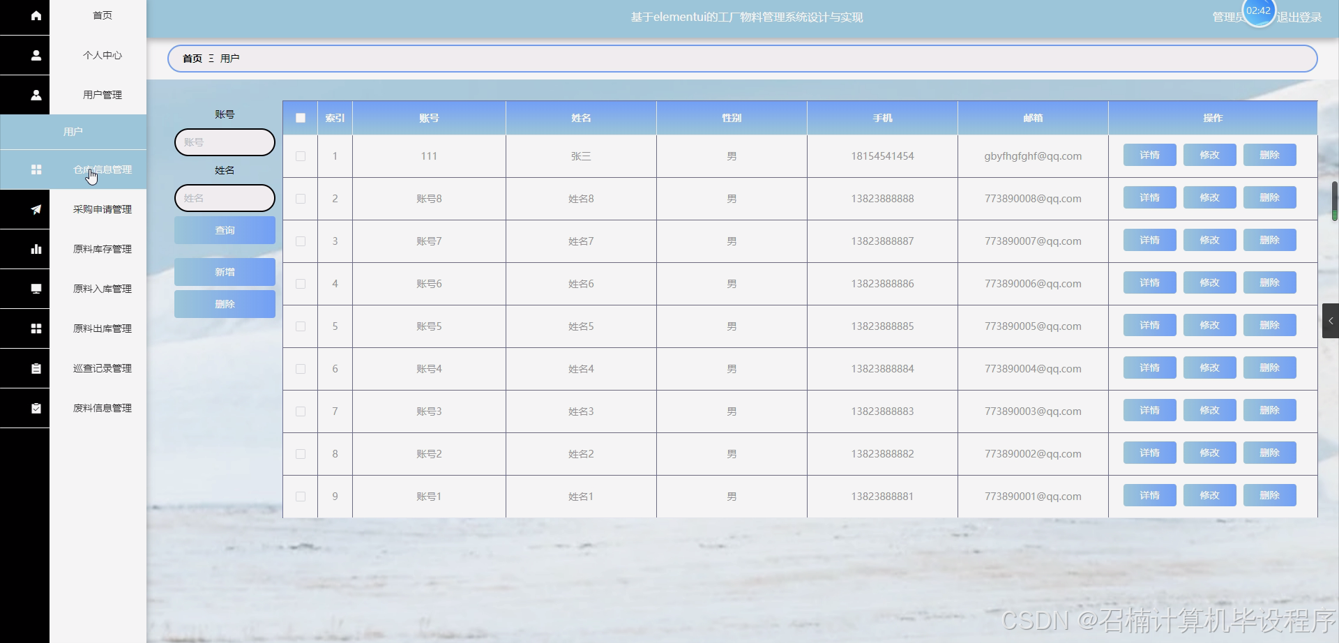 用户管理模块:实现用户的注册、登录、权限分配和个人信息管理等功能。系统将对用户进行角色划分,如管理员、仓库管理员、采购员等,并为不同角色分配不同的权限,以确保系统的安全性和数据的保密性。