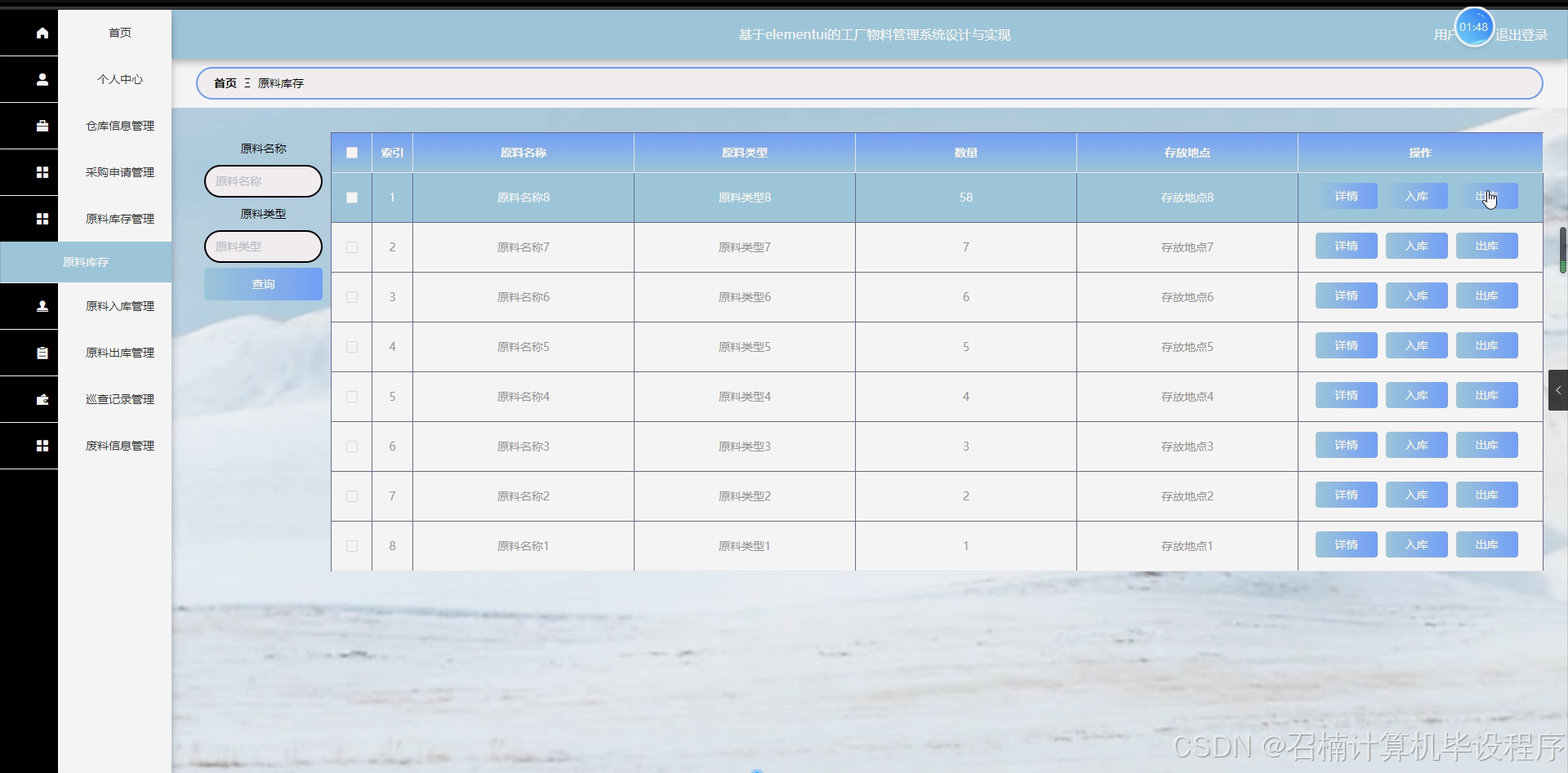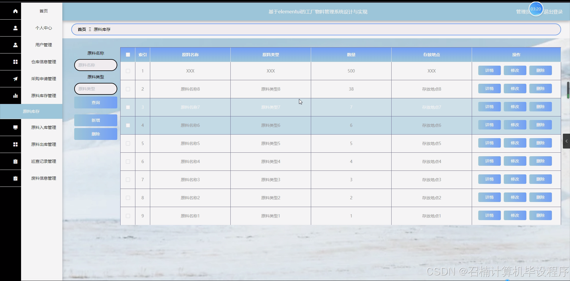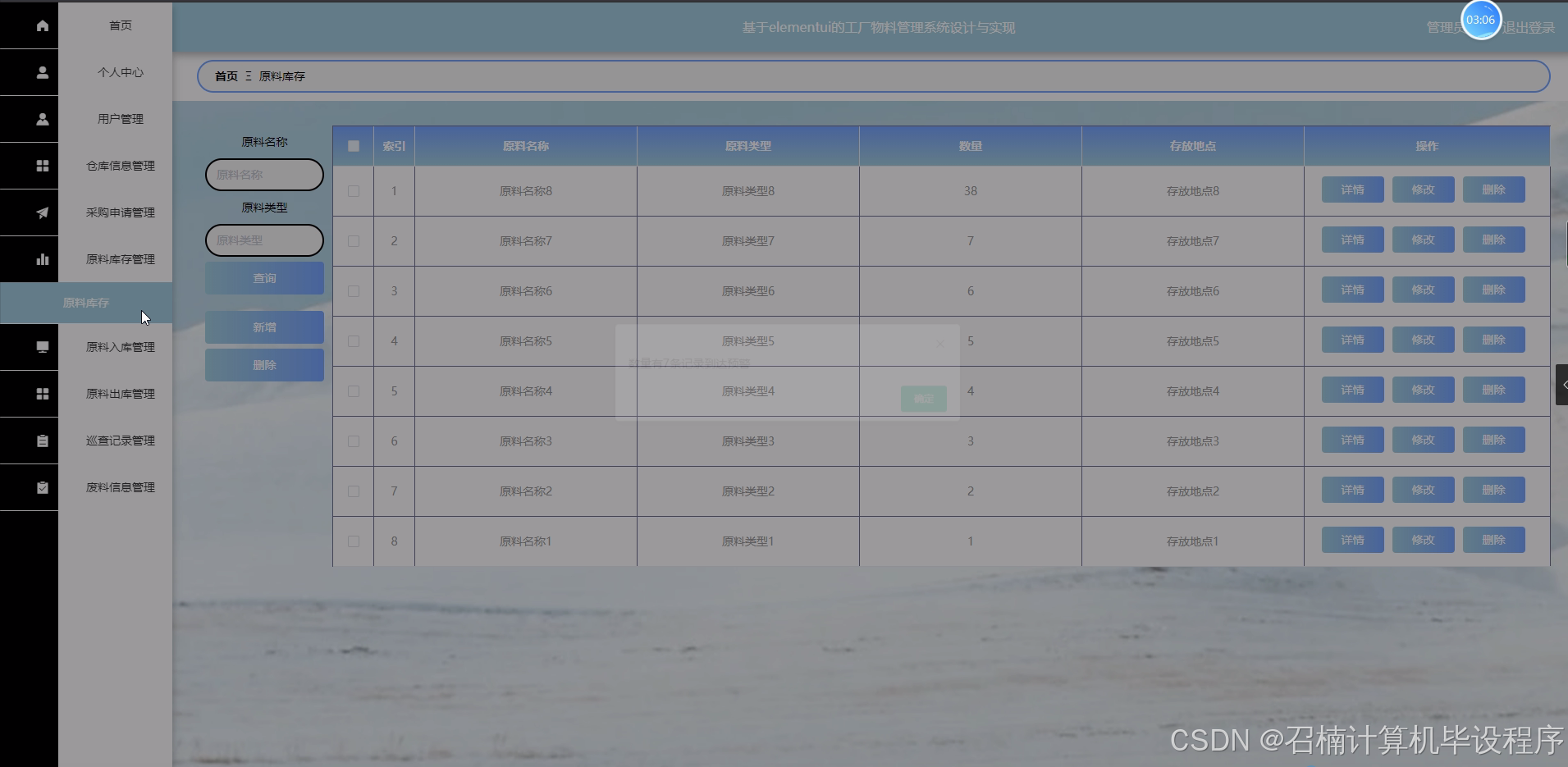 原料库存管理模块:实现原料库存的实时更新、盘点、预警和报表等功能。系统将对原料库存进行实时监控,包括库存数量、库存位置、库存周期等信息。当库存数量低于安全库存时,系统将自动发出预警,提醒仓库管理员进行补货操作。同时,系统还将提供库存报表功能,以便企业更好地掌握库存情况。