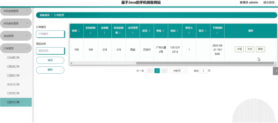 管理员点击订单管理,在订单管理页面的对已取消订单、已退款订单、未支付订单、已发货订单、已支付订单、已完成订单等内容,进行查询或者删除订单信息等操作,如图5-14所示。