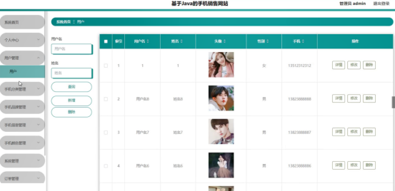 管理员点击用户管理,在用户管理页面的输入用户名、姓名、头像、性别、手机等内容,进行查询、新增或者删除用户信息等操作,如图5-9所示。