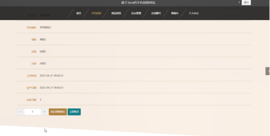 手机信息展示:展示手机的详细信息,包括手机编号、名称、图片、分类、品牌、颜色、材质、内存、上市时间、生产日期、库存和价格等。