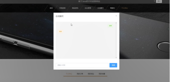 点击在线聊天,用户可以输入内容进行咨询,管理员可以在后台进行查看并回复,达到用户和管理员交流的效果,如图5-4所示: